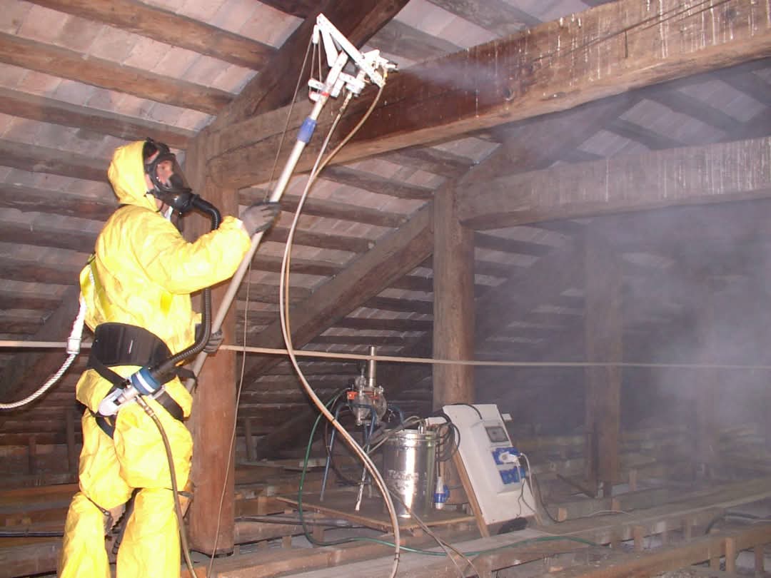 In un secondo momento, una volta che il liquido ha avuto il tempo di agire e di raggiungere le zone più profonde, il veicolante contenente il principio attivo verrà nebulizzato su tutte le superfici infestate. Questo trattamento non solo elimina le larve e gli insetti già presenti all’interno del legno, ma genera anche un film protettivo che agisce come barriera anti-alimentare, noto come "antifeeding". Tale barriera impedisce agli insetti xilofagi di nutrirsi ulteriormente del legno trattato.